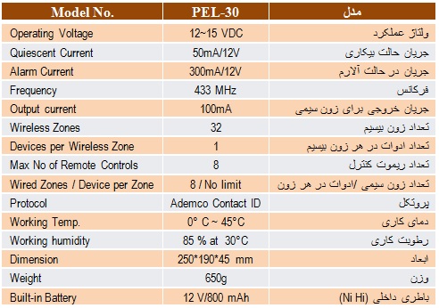 - 32 زون بیسیم (یک زون اختصاصی برای هر سنسور) که باعث افزایش دقت و ثبات کار سیستم گردیده و گزارشات دقیقی از وضعیت عملکرد سنسورها ارائه می نماید، از جمله ضعف باطری، ایراد داخلی سنسور و آلارم Dedicated Zoning Design